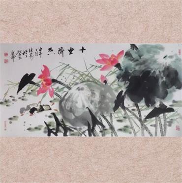| 张继涛《十里荷香》  阅览量:2587 作者:张继涛 张继涛  山东济阳人,1975年3月出生。笔名紫风、长风,字大波,号紫玉斋主、六尺斋主。本科学历。 现为中国美术教育学会会员 山东省书画学会会员 济南美术家协会会员 济南青年书法家协会会员 济阳画院副院长(高级美术师) 济阳县美术书法家协会理事兼副秘书长 当代美术家网提名推荐画家 艺术简历与成就: 毕业于山东师范大学美术系,学习期间得到山东省美协主席张望先生的亲授,后师从中国著名实力派画家张华之先生。现从事小学美术教学研究工作,闲暇之余酷爱泼墨,主攻花鸟题材,尤以墨竹、荷花见长。其作品用笔泼辣,传统笔墨技法扎实,在继承传统的基础上,更注重现代意识的融汇开拓,构图布局气势恢宏,墨色浓淡有致,再现生活情趣。画意随心、追求自然是其作品的一大特色。作品多次参加省市大型展览并获奖刊登、多次在省内外报刊杂志发表。代表作有《荷塘月色》、《劲节》、《节节高》等一系列优秀作品。 详细说明
