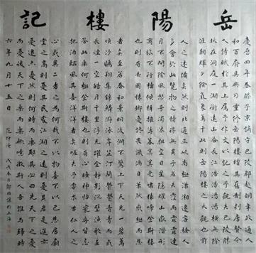 | 邹贻让《岳阳楼记》  阅览量:2622 作者:邹贻让 邹贻让,男,1963年出生居住上海。邹贻让习字近四十年,尤以小楷见长。 上海书法院副院长 当代中国诗书画研究会上海分院院长 国家一级美术师 中国楹联学会理事 赵曼美术馆专业书法家 中国书法协会会员 中国军事文化研究会上海基本理事 中博国际文化艺术中心书法高级顾问 中国红色信仰书画协会特聘书法家 中国画都网书画苑特聘签约书法家 作品曾荣获第十届国际精品书画大赛金奖;第二届板桥杯全国书画大赛优秀奖;第二届将军杯全国书画大赛大奖;澳门书画联展特别优秀奖。并在市地级书画展览多次获奖。书画频道《收藏天下》专题采访报道及全国多家媒体刊登报道。作品被海内外多家知名企业家及友人收藏。书写的经文在港澳台多家收藏。2016年入围全球艺术名家百强,2017年进入书画艺术名家实录 详细说明