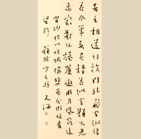 | 宋·苏轼《少年游·润州》  阅览量:2752 作者:刘文海 刘文海,别署抚琴斋主,山东德州人(原籍乐陵)。幼从叶效原先生习书,后进修于南京艺术学院,师从徐利明先生。首都师范大学书法文化研究院艺术硕士,师从王元军先生。曾问教于刘正成、于明诠、吴振立、徐本一、黄惇诸先生。 艺术职称: 现为中国书法家协会会员 山东省书法家协会第四届理事、草书委员会副秘书长 九三学社中央书画院成员 德州学院、齐鲁师范学院教授、硕士生导师 详细说明