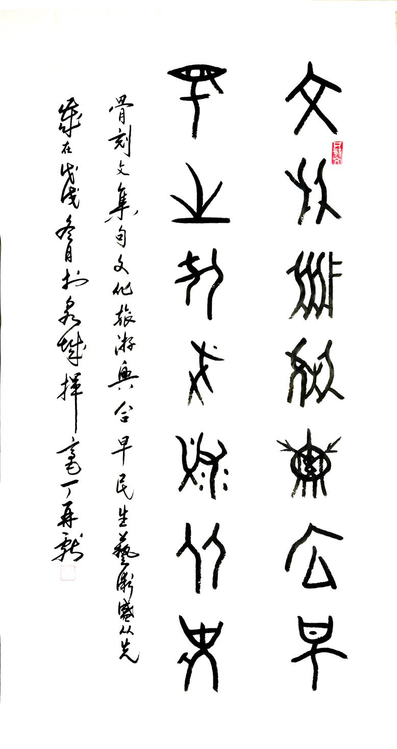 | 丁再献骨刻文书法《文旅兴》  阅览量:2721 作者:丁再献 丁再献,作家、诗人、国家一级书法家、中华国礼艺术家、著名东夷文化学者。1952年2月生于山东沂南,字章甫,号北海。自幼酷爱诗词、书法,受教于孙轶青、欧阳中石、蒋维崧、魏启后诸先生,被收入中国书法家协会主编的《当代中国书法名人辞典》和山东书协主编的《当代山东书法家辞典》。由于首先系统破译出东夷骨刻文字、始创了骨刻文字书法艺术、发表了大量东夷文化论著,被媒体和业界誉为骨刻文字系统破译者、骨刻文书法艺术创始人。