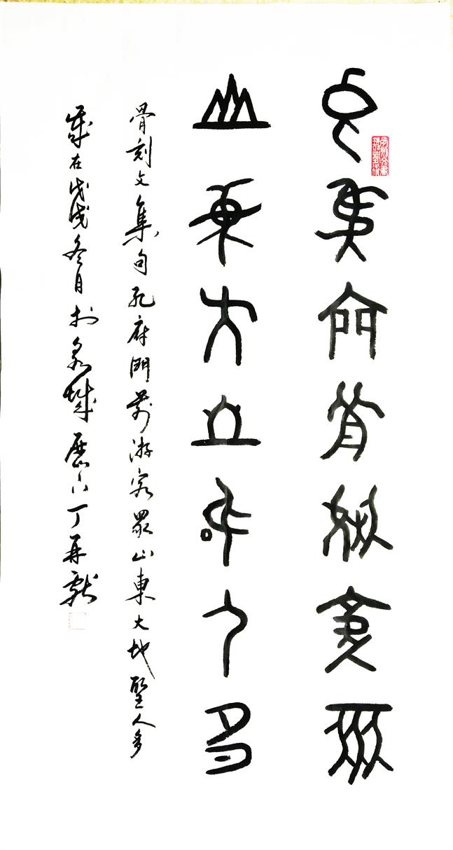 | 丁再献骨刻文书法《孔府》  阅览量:2663 作者:丁再献 丁再献,作家、诗人、国家一级书法家、中华国礼艺术家、著名东夷文化学者。1952年2月生于山东沂南,字章甫,号北海。自幼酷爱诗词、书法,受教于孙轶青、欧阳中石、蒋维崧、魏启后诸先生,被收入中国书法家协会主编的《当代中国书法名人辞典》和山东书协主编的《当代山东书法家辞典》。由于首先系统破译出东夷骨刻文字、始创了骨刻文字书法艺术、发表了大量东夷文化论著,被媒体和业界誉为骨刻文字系统破译者、骨刻文书法艺术创始人。