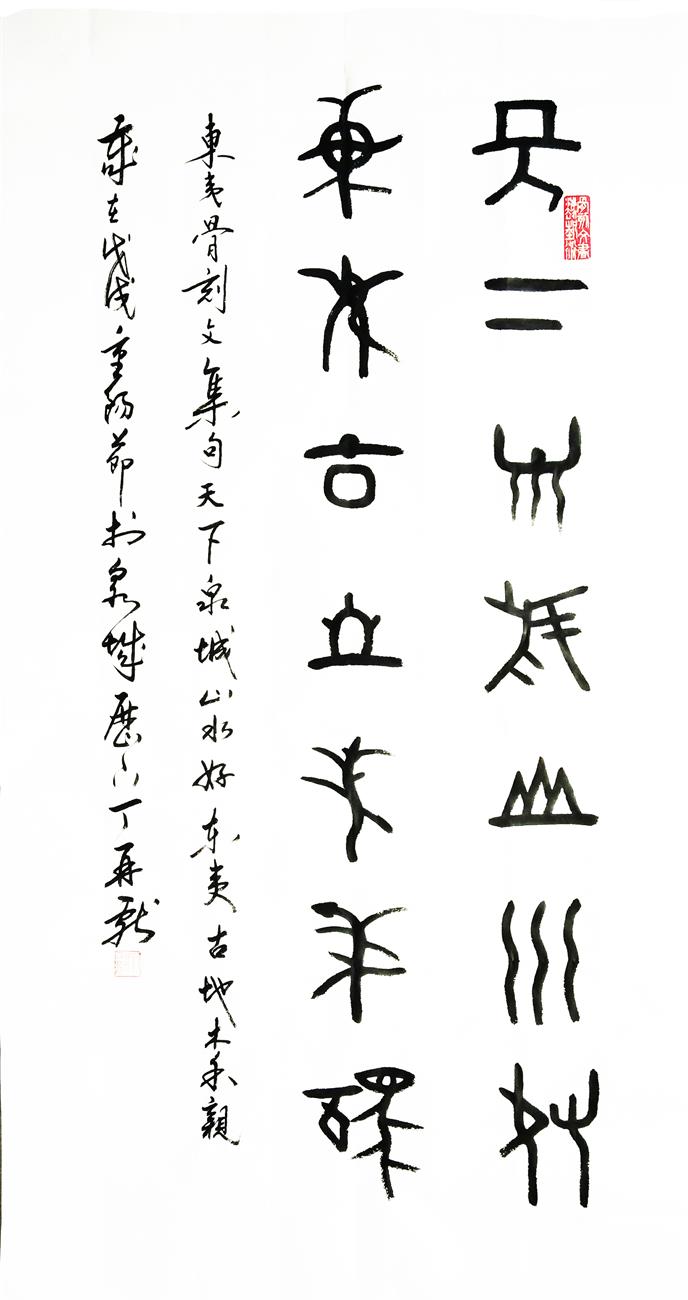 | 丁再献骨刻文书法《七绝》  阅览量:2379 作者:丁再献 丁再献,作家、诗人、国家一级书法家、中华国礼艺术家、著名东夷文化学者。1952年2月生于山东沂南,字章甫,号北海。自幼酷爱诗词、书法,受教于孙轶青、欧阳中石、蒋维崧、魏启后诸先生,被收入中国书法家协会主编的《当代中国书法名人辞典》和山东书协主编的《当代山东书法家辞典》。由于首先系统破译出东夷骨刻文字、始创了骨刻文字书法艺术、发表了大量东夷文化论著,被媒体和业界誉为骨刻文字系统破译者、骨刻文书法艺术创始人。
