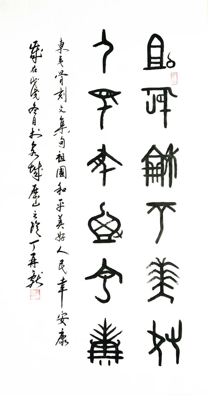 | 丁再献骨刻文书法《对联》  阅览量:2750 作者:丁再献 丁再献,作家、诗人、国家一级书法家、中华国礼艺术家、著名东夷文化学者。1952年2月生于山东沂南,字章甫,号北海。自幼酷爱诗词、书法,受教于孙轶青、欧阳中石、蒋维崧、魏启后诸先生,被收入中国书法家协会主编的《当代中国书法名人辞典》和山东书协主编的《当代山东书法家辞典》。由于首先系统破译出东夷骨刻文字、始创了骨刻文字书法艺术、发表了大量东夷文化论著,被媒体和业界誉为骨刻文字系统破译者、骨刻文书法艺术创始人。