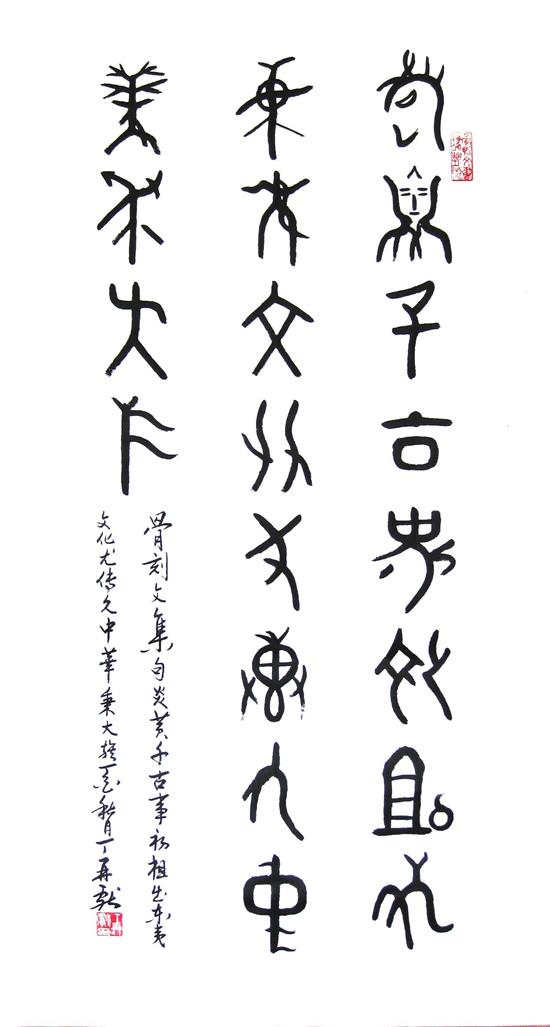 | 丁再献骨刻文书法《五言》  阅览量:2668 作者:丁再献 丁再献,作家、诗人、国家一级书法家、中华国礼艺术家、著名东夷文化学者。1952年2月生于山东沂南,字章甫,号北海。自幼酷爱诗词、书法,受教于孙轶青、欧阳中石、蒋维崧、魏启后诸先生,被收入中国书法家协会主编的《当代中国书法名人辞典》和山东书协主编的《当代山东书法家辞典》。由于首先系统破译出东夷骨刻文字、始创了骨刻文字书法艺术、发表了大量东夷文化论著,被媒体和业界誉为骨刻文字系统破译者、骨刻文书法艺术创始人。