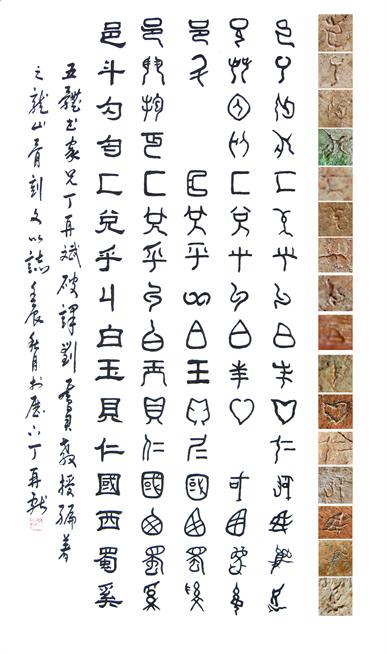 | 丁再献破译骨刻文  阅览量:2560 作者:丁再献 丁再献,作家、诗人、国家一级书法家、中华国礼艺术家、著名东夷文化学者。1952年2月生于山东沂南,字章甫,号北海。自幼酷爱诗词、书法,受教于孙轶青、欧阳中石、蒋维崧、魏启后诸先生,被收入中国书法家协会主编的《当代中国书法名人辞典》和山东书协主编的《当代山东书法家辞典》。由于首先系统破译出东夷骨刻文字、始创了骨刻文字书法艺术、发表了大量东夷文化论著,被媒体和业界誉为骨刻文字系统破译者、骨刻文书法艺术创始人。