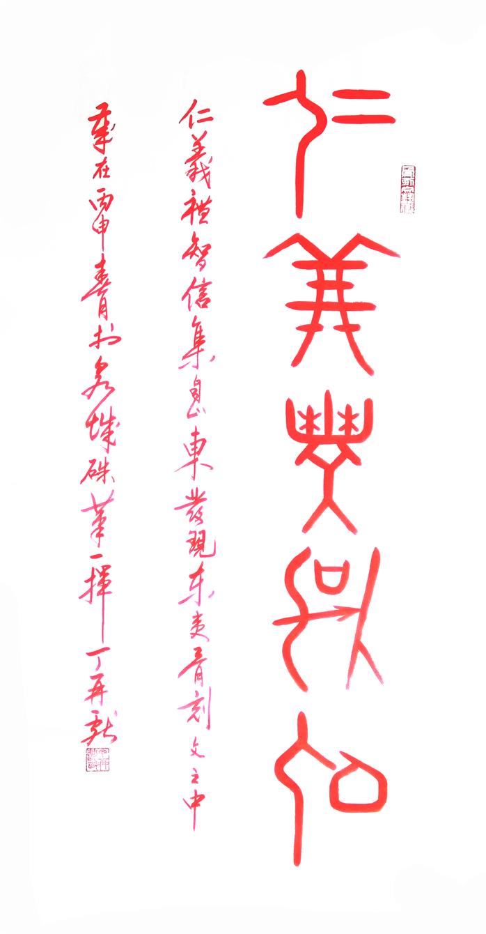 | 丁再献骨刻文书法  阅览量:2683 作者:丁再献 丁再献,作家、诗人、国家一级书法家、中华国礼艺术家、著名东夷文化学者。1952年2月生于山东沂南,字章甫,号北海。自幼酷爱诗词、书法,受教于孙轶青、欧阳中石、蒋维崧、魏启后诸先生,被收入中国书法家协会主编的《当代中国书法名人辞典》和山东书协主编的《当代山东书法家辞典》。由于首先系统破译出东夷骨刻文字、始创了骨刻文字书法艺术、发表了大量东夷文化论著,被媒体和业界誉为骨刻文字系统破译者、骨刻文书法艺术创始人。