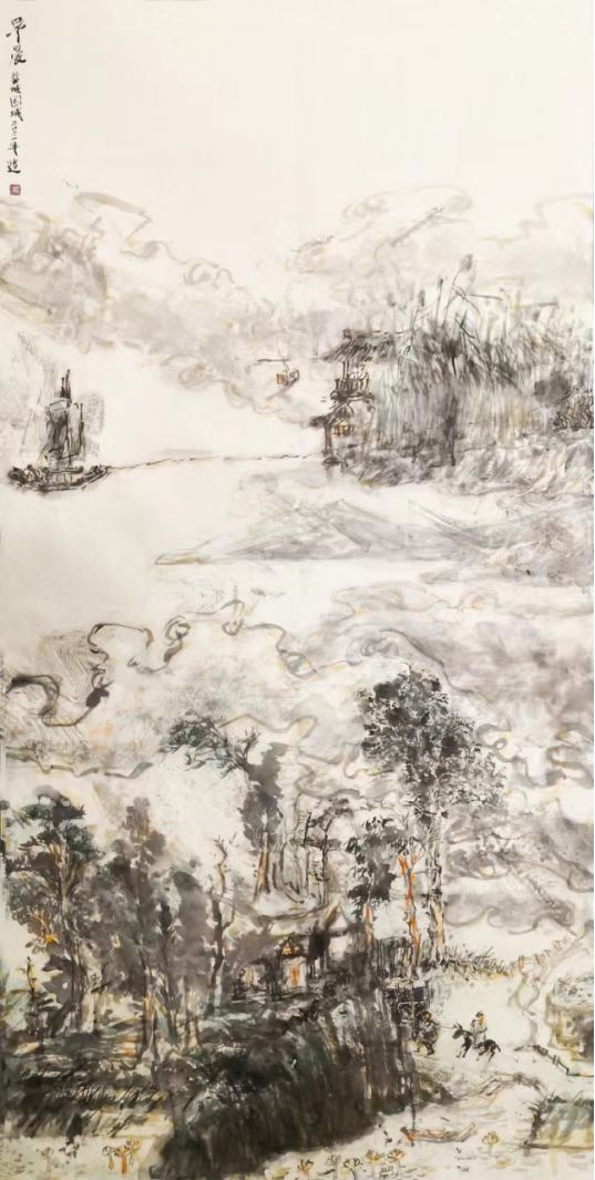 余国城《早晨》 2021年 139cmX200cm 纸本设色 |