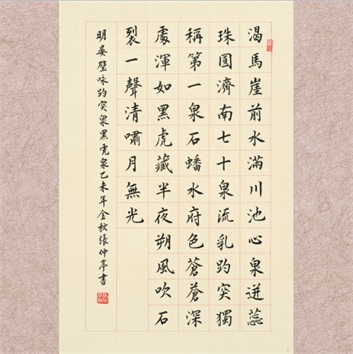| 张仲亭小楷《明晏璧《咏趵突泉》  阅览量:3928 作者:张仲亭专栏 张仲亭,1947年生,山东济南人 艺术职称: 著名书法家 中国书法家协会理事 山东省书法家协会原副主席 济南市书法家协会原主席 当代美术家网推荐书法家 艺术简介: 自幼酷爱书法,习书50余年,用功极勤。一生致力于书法的探索和研究,脚踏实地临习古帖,着实下了一番苦夫,形成了南北相揉,雅俗共赏、流丽艳美的书法特点,得到了社会各界的广泛认可和好评。特别是张仲亭的小楷,兼收传统小楷的正、真、规、范,糅合了“二王”行书的流利艳美,不再凝重滞板,呈现着气息通透而趋向于动态的美感,形成人人喜爱、雅俗共赏的新书风,这是张仲亭先生对书法发展史的重要贡献。 ------------------------------------------------------------ 艺术成就与贡献: 张仲亭书写的道家对联“入真门秉真心参透真玄真自在,来妙理达妙境展开妙道妙神通”,在泰山碧霞祠碧霞元君两旁已悬挂20余年,被千万人所咏读赞赏; 2009年,张仲亭所书的杜甫诗《望岳》书法,在中华人民共和国第十一届运动会开幕式巨型大碗幕上展示 ,享誉海内外;成为张仲亭书法艺术生涯的两大亮点。 详细说明