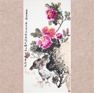 | 张克华《富贵吉祥》  阅览量:1980 作者:张克华专栏 张克华艺术简介 张克华(笔名:青山墨人),1961年出生于山东新泰,毕业于山大研究生院,空军大校。 艺术职称: 现为中国国际艺术家学会副主席 中国书画协会副主席 中国美术家协会会员 中国书法家协会会员 中国收藏家协会会员 中国国画家协会理事 解放军美术书法研究院空军创作员 山东省美术家协会理事 山东省书法家协会理事 山东省文联委员 济南市书法家协会副主席 济南市奇石协会副会长 中华东岳书画院院长 当代美术家网推荐国画家 艺术简介与成就: 自幼酷爱书画艺术,1979年12月携笔保从戎,从事书画创作30余年,苦苦追求艺术真谛,善集众家之长,注重吸取清代书画大师赵之迁、任伯年、吴昌硕和当代书画大师王雪涛等艺术之精华,师古人而不为其所囿,师今人而不拘一家,书画作品逐渐形成自己的风格。其书画作品曾多次参加军地举办的大型展览并多次获奖。先后在《解放军报》、《解放军画报》、《解放军生活》《空军报》、《前卫报》、《解放日报》、科技日报》、《生活日报》、《艺术中国报》、《诗书画报》、《中国书画界》、《羲之书画报》、《艺术中国报》、《诗书画报》等新闻媒体作了专题报道。其书画传略被辑入《世界书画家大辞典》、《中国艺术界名人录》、《国际现代书画篆刻家大辞典》、《中国书法家精品选集》、《新世纪书画家辞典》、《中国风·杰出人物特集》、《庆六十周年当代名家经典》、《当代名家书画作品集》、《山东书法家》等30余部大型辞书。2004年被中国国画家协会授予“2004年中国书画百杰”。2007年3月被中国国学研究会授予“国学家”荣誉称号。被中国时代人物评选委员会评为2007年度“中国时代人物”。2007年12月获中国文艺金像奖,并被中国书画名家研究会授予六十位“当代艺术名家”荣誉称号。2008年荣获“国际艺术创作成果奖”金奖,被中国国际书法家联合会,中国书画家创作协会授予“国际杰出创作艺术家”称号。被国际中华艺术家协会,中国书画艺术家协会联合授予“和谐门第,文化世家”荣誉称号。在人民大会堂光荣的出席2009中国文化艺术突出贡献人物新年座谈会。2009年12月被评为中国山东省籍21世纪最具收藏价值100名书画名家;2010年1月被中国文联出版社评为当代最具投资潜力的书画名家;2010年12月组织成立中华东岳书画院并担任院长;2011年 7月被评为最具诚信与社会影响力的山东当代中国书法十大名家;2012年1月被评为最具收藏价值与升值潜力的中国画花鸟百家。2012年6月江苏美术出版社出版国画三名家《刘大为、贾又福、张克华作品集》。2013年8月被评为最具收藏价值与升值潜力中国画花鸟36家。 详细说明