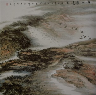 杜仲增《秋江飞鸟图》 尺幅:68X68cm