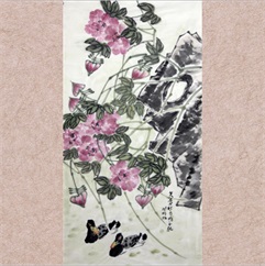 曾昭明《芙蓉戏水鸭正肥》 68X138cm